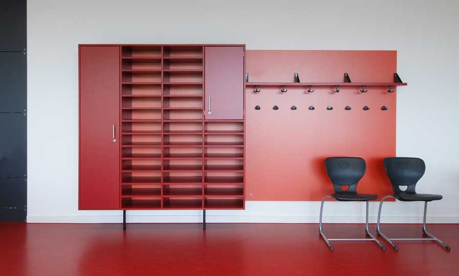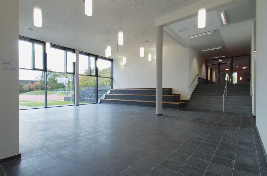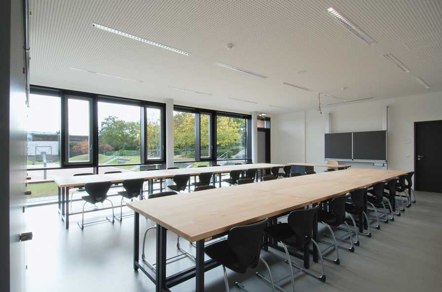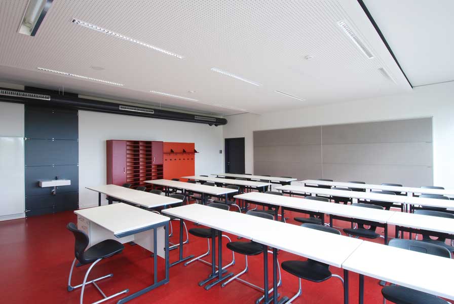 Im Obergeschoss befinden sich 8 Klassenräume, drei Gruppenräume und Nebenräume. Eine erweiterte Flurzone als offene Klasse und die Gruppenräume bieten Möglichkeiten für moderne Unterrichtsformen.