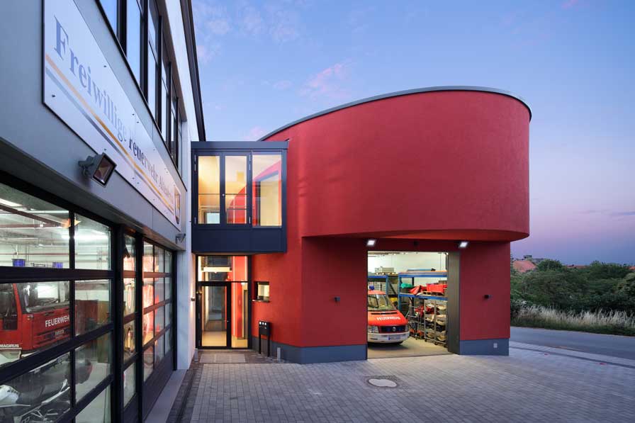 Erweiterung des Feuerwehrgerätehauses an einer Großsporthalle auf minimaler Grundstücksfläche